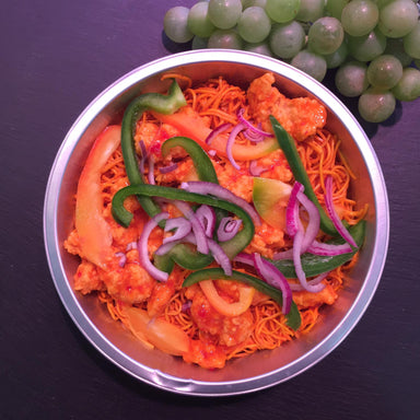 €7,95| /Crispy shredded chicken marinated in sweet Chilli sauce, on a bed a noddles coated in piri piri sauce with sliced peppers and red onions. Made in S...